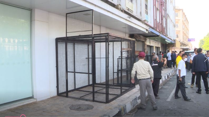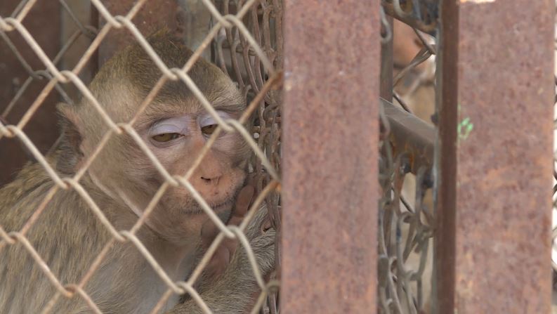 Large cages have been placed in front of the Lopburi Asia Hotel. Small pieces of food, such as peanuts, are scattered to attract the monkeys into the cages and to keep the monkeys inside for longer.
