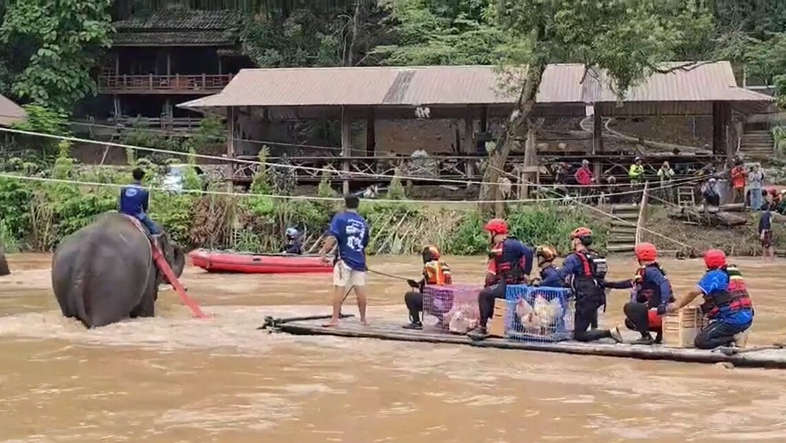 CHIANG MAI, June 12 (TNA) – Over 30 rescuers and four trained elephants conducted a large-scale drill in Mae Taeng District to prepare for flash floods and evacuate animals. The exercise followed a 2024 flash flood in the Mae Taeng River that killed numerous livestock and elephants.