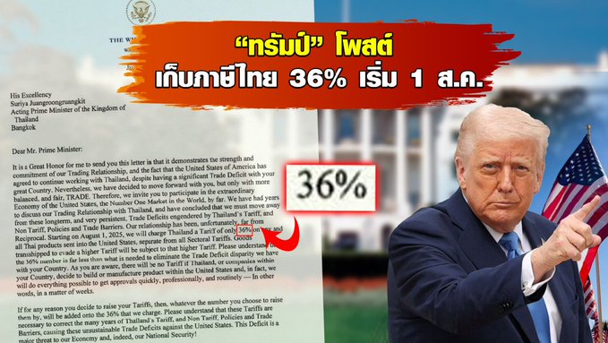 BANGKOK, July 8 (TNA) – The United States will implement a 36% import tariff on all Thai products starting August 1, 2025, U.S. President Donald Trump announced in a letter dated July 7 to Thailand’s Acting Prime Minister Suriya Juangroongruangkit.