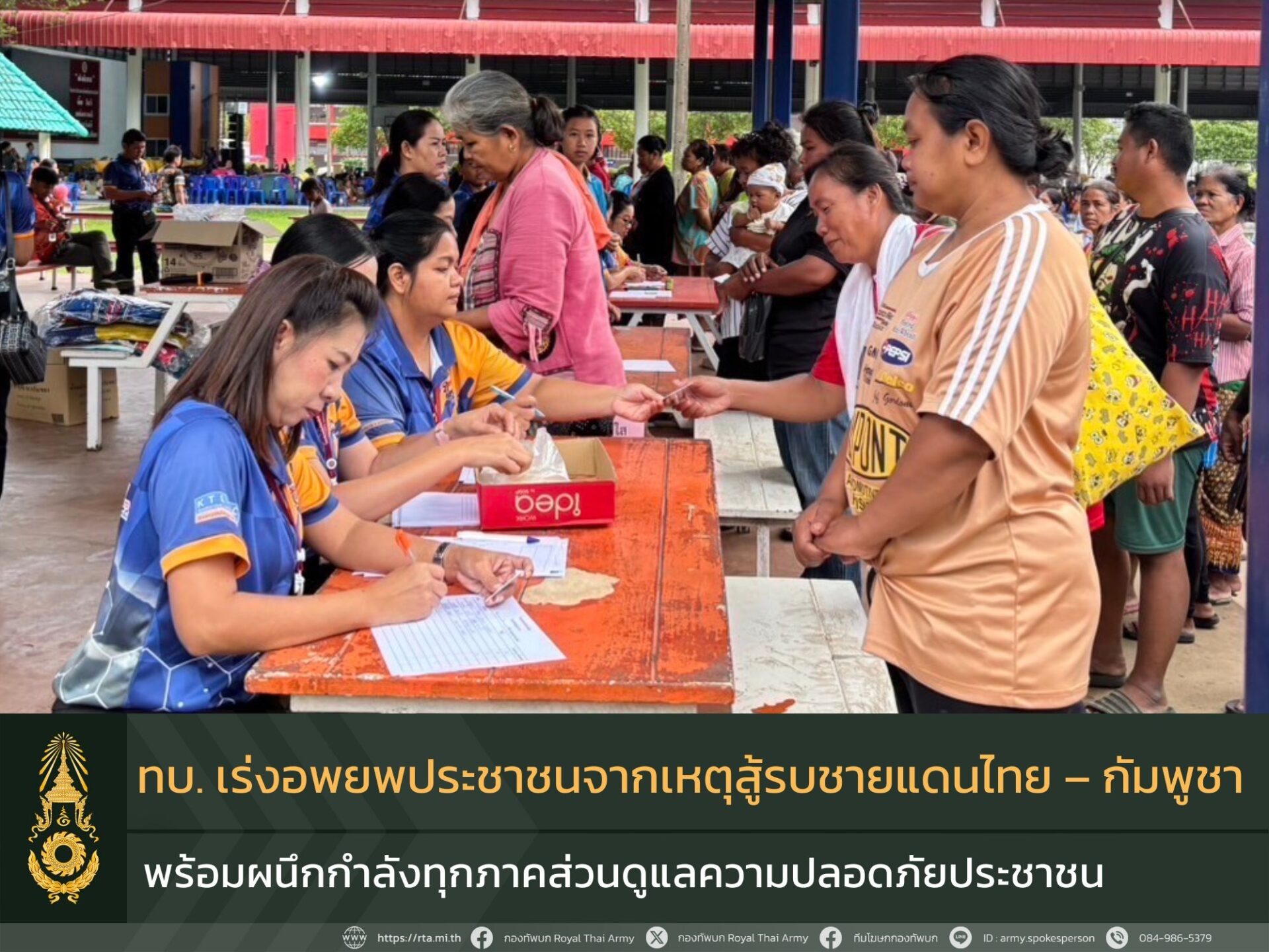 The Royal Thai Army has established six royal kitchens and deployed two mobile field kitchens to provide food to the displaced. Additionally, the 22nd Military Circle, in coordination with Ubon Ratchathani province, has deployed volunteer units to patrol and protect the properties of evacuated residents, aiming to ease their concerns about personal belongings. -819 (TNA)