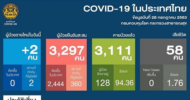 The two male soldiers are 22 and 25 years old. They returned from Hawaii on July 22 on the same flight of six other soldiers previously confirmed with the infection. They were quarantined in Chon Buri province, tested positive on July 26 and were admitted at a hospital in Bangkok.