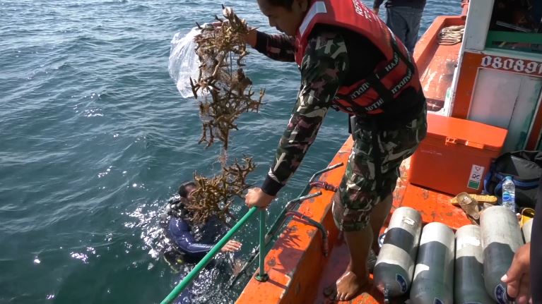 CHUMPHON, August 19 (TNA) – A team of scuba divers clean up trash and restore coral reels in a rehabilitation project at Thailand’s Chumphon Islands National Park.