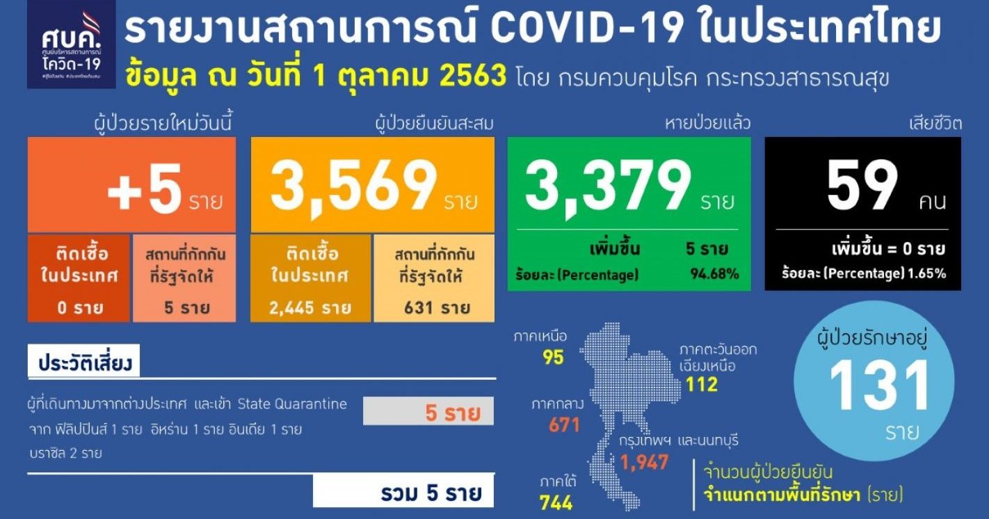 BANGKOK, Oct 1 (TNA) — The Centre for Covid-19 Situation Administration on Thursday reported five new cases in state quarantine.