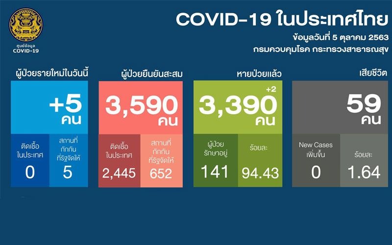 Meanwhile, the Center for COVID-19 Situation Administration reported five new cases of the coronavirus disease 2019. All were quarantined arrivals, raising the total to 3,590.