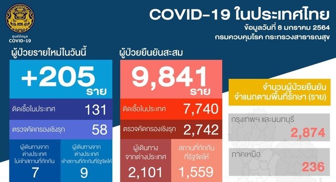 BANGKOK, Jan 8 (TNA) – The COVID-19 Information Center reported 205 new cases of the coronavirus disease 2019 and the total rose to 9,841.