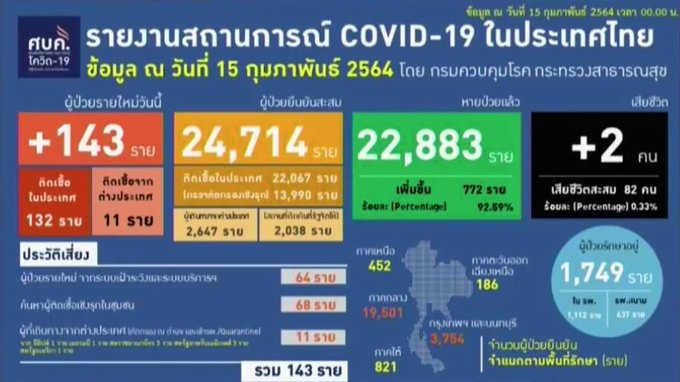 Thailand on Monday reported 143 new Covid-19 cases and two more deaths. The total cases reached 24,714 and the death toll rose to 82.