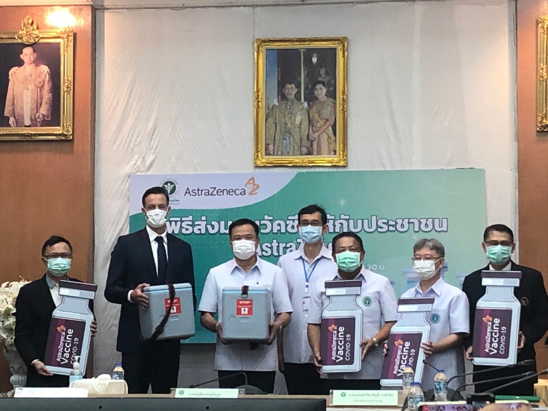 Dr Kiattiphum Wongrajit, permanent secretary for public health, and Dr Opas Karnkawinpong, director-general of the Department of Disease Control, witnessed the delivery from AstraZeneca (Thailand). The lot of vaccine doses will support inoculation for general people from June 7 onwards.