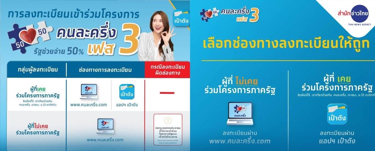 Those who enjoyed the subsidy in the first two phases of the program must register anew for the latest phase. Newcomers can register at www.คนละครึ่ง.com. The people who had applied for any subsidy programs such as Chim Shop Chai (Eat, Shop, Spend), We Travel Together, co-payment, We Win and Section 33 We Love Each Other can register at the website and the Pao Tang app. This morning the Pao Tang app did not function. Registrants were advised to use the www.คนละครึ่ง.com instead.