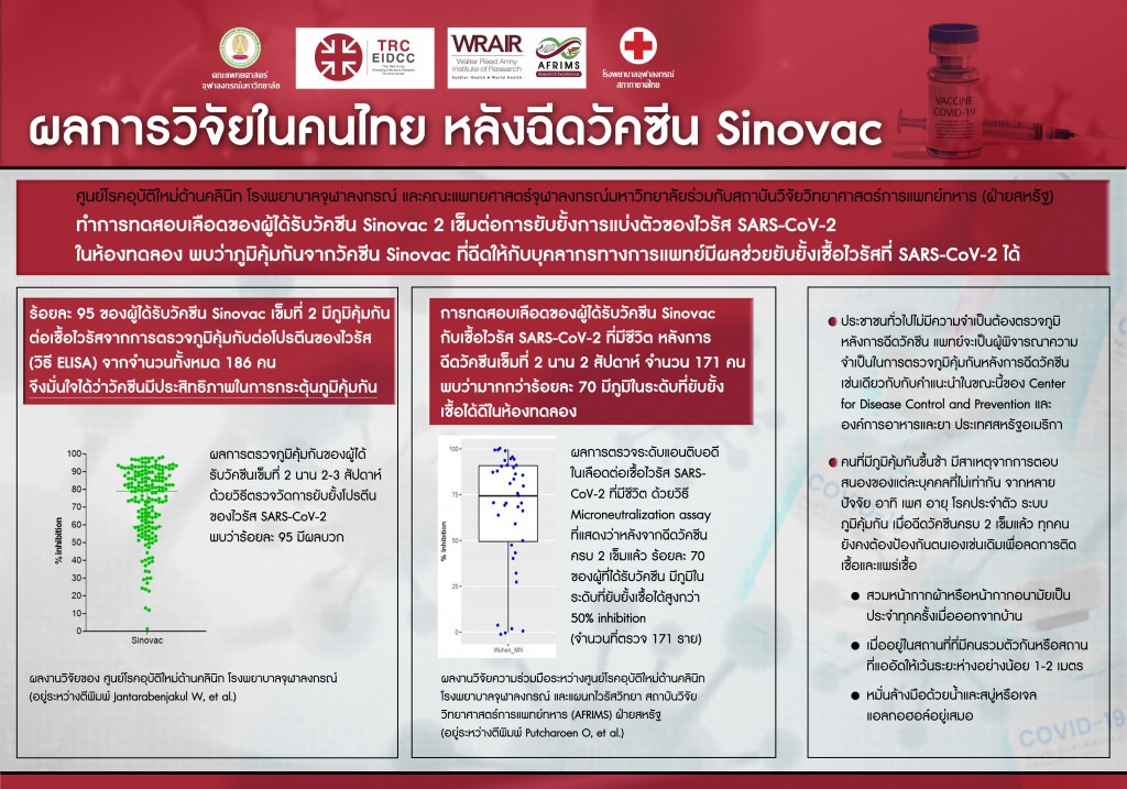 BANGKOK, June 18 (TNA) – A research has found the efficacy rate of Sinovac’s COVID-19 vaccine is higher than 50% among the Thai people who have received two doses, according to Chulalongkorn University.