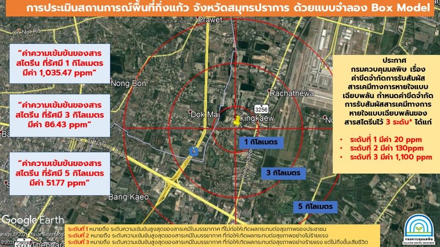 The department initially found styrene concentrations amounted to 1,035.47 ppm in the air within the one-kilometer radius of the factory, which was harmful to health. The concentrations were 86.43 ppm in the three-kilometer radius and 51.77 ppm in the five-kilometer radius.