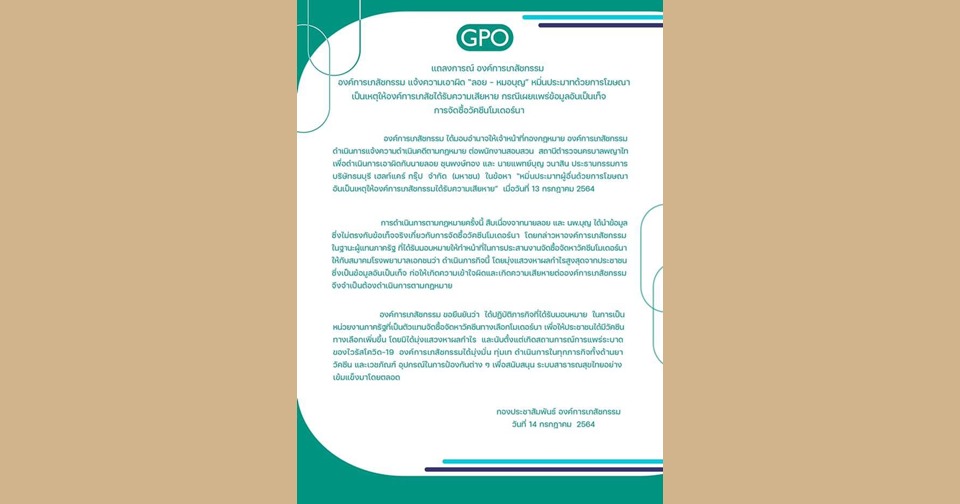 GPO filed its complaint with the Phaya Thai police station on July 13. It said Mr Loy and Dr Boon falsely accused it of intending to maximize profit from acquiring the Moderna vaccine on behalf of the government for inoculation by private hospitals.