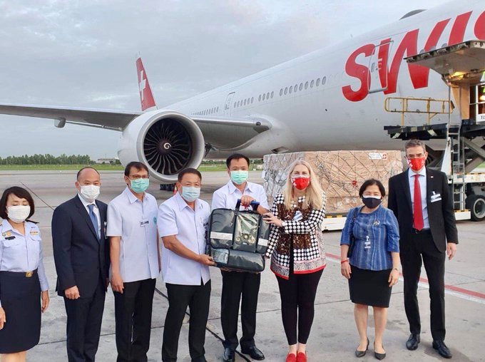 Meanwhile, the Swiss government donated 100 ventilators, over 1 million rapid antigen test kits and other medical supplies. The donations weighing altogether 26 tons worth 9 million Swiss francs arrived at Suvarnabhumi airport this morning. (TNA)