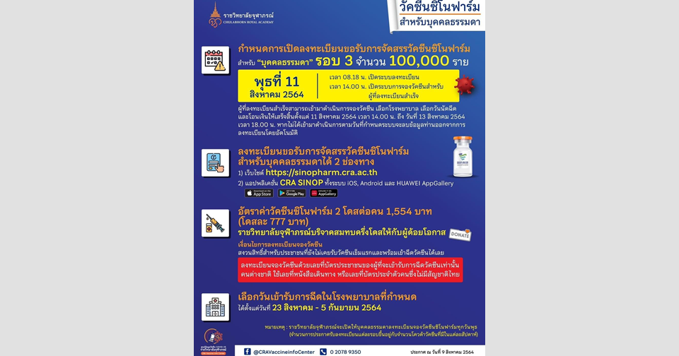Meanwhile, the Chulabhorn Royal Academy issued its third invitation for general people to book Sinopharm vaccinations against COVID-19 on Aug 11. The academy planned to receive the bookings at 8.18am via https://sinopharm.cra.ac.th and the CRA SINOP app. Registrants can choose their hospital and schedule for the vaccination at 2pm on the same day. (TNA)