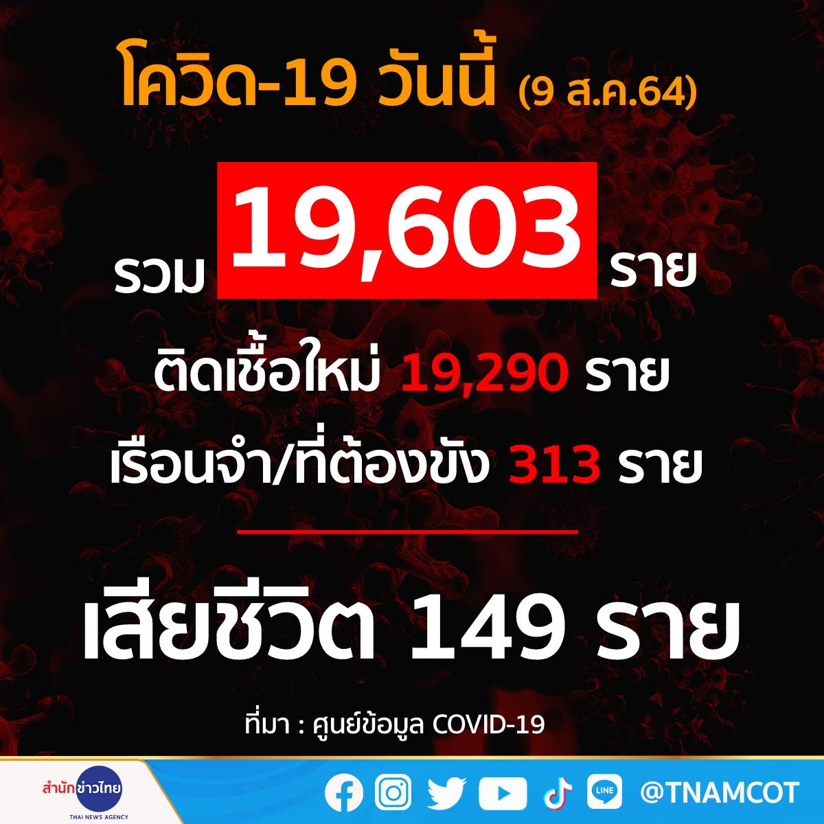 BANGKOK, Aug 9 (TNA) – Thailand logged 19,603 new COVID-19 cases and 149 new fatalities, according to the Center for COVID-19 Situation Administration.