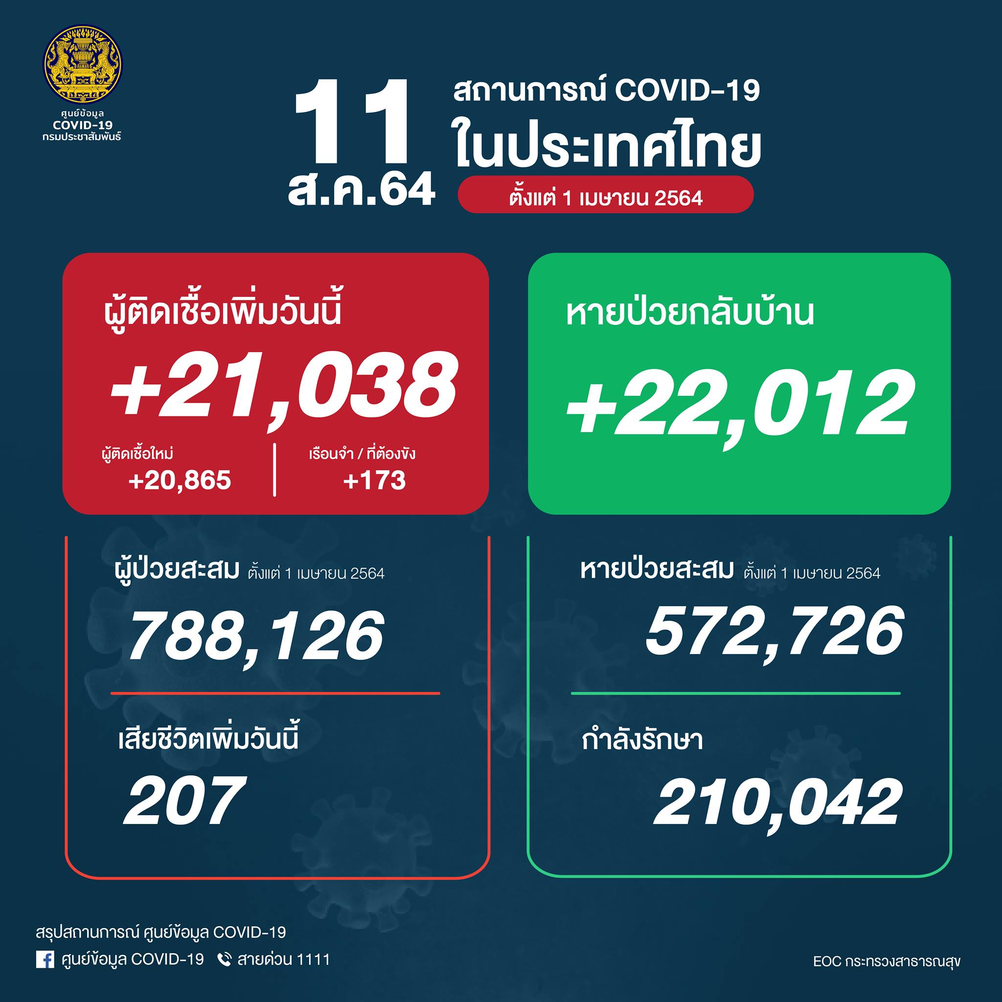 BANGKOK, Aug 11 (TNA) – Thailand logged 21,038 new COVID-19 cases, for a total of 816,989 cases, and 207 new fatalities over the past 24 hours.