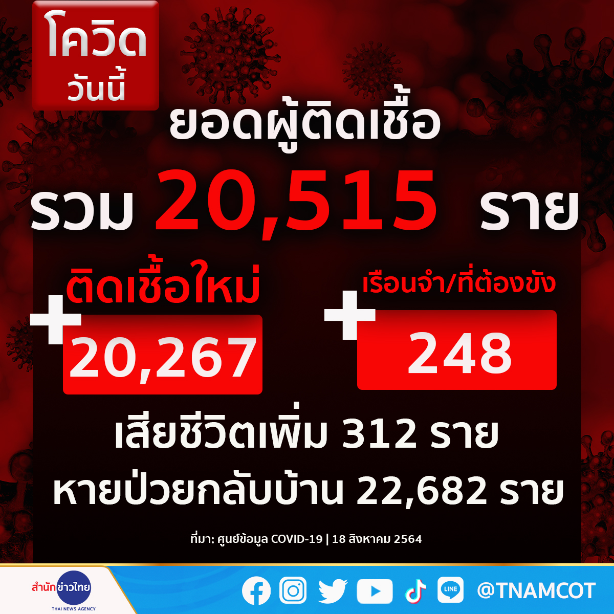 BANGKOK, Aug 18 (TNA) – The country logged a new record high of 312 daily COVID-19 fatalities and recorded 20,515 new patients over the past 24 hours, the Public Health Ministry reported.