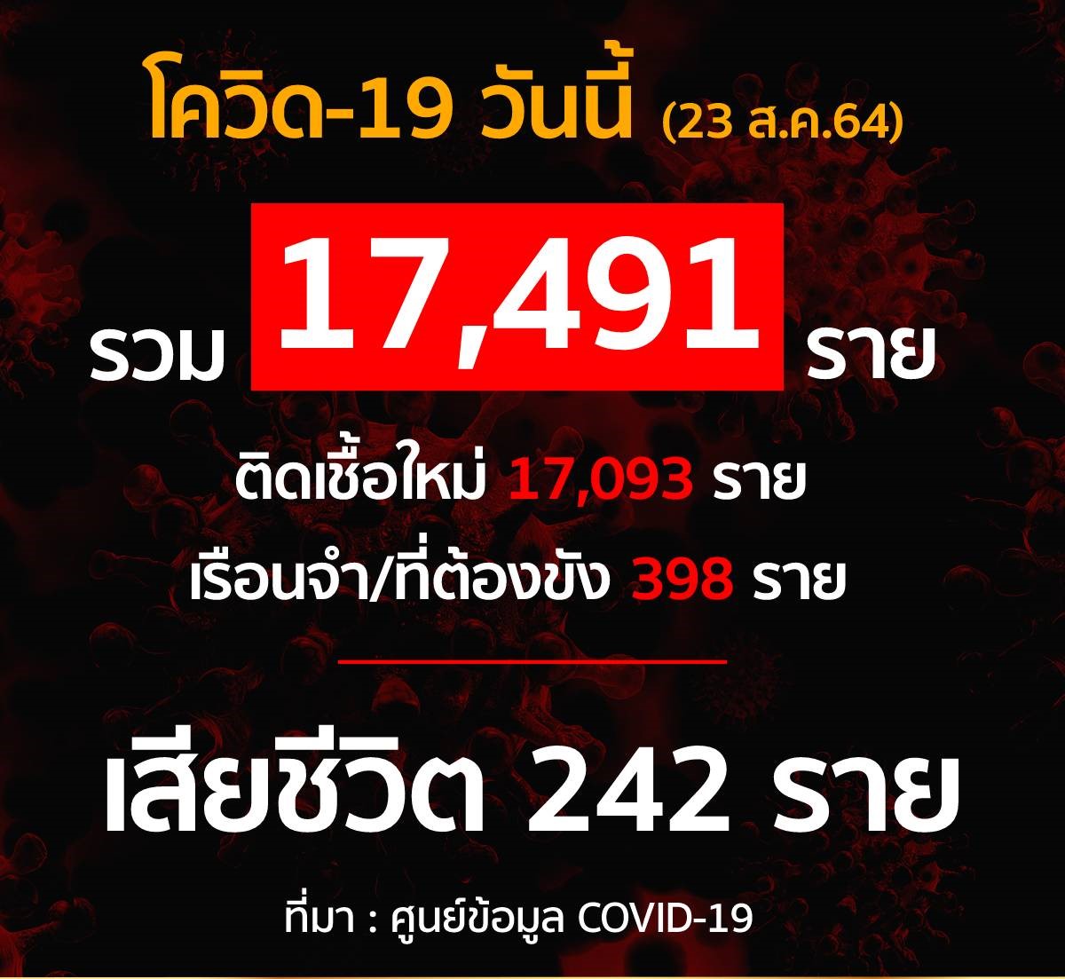 BANGKOK, Aug 23 (TNA) – Thailand logged 17,491 new COVID-19 cases and 242 fatalities over the past 24 hours, the Public Health Ministry reported.