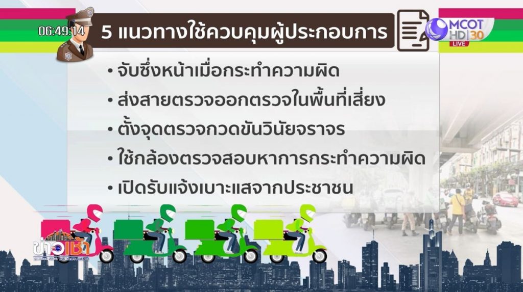 He also said that police would take legal action against all traffic offences that deliverymen made including violation to traffic lights and traffic directions and the use of footpaths. Such offences carried a jail term of up to three months and/or a fine of 2,000-10,000 baht, Pol Gen Damrongsak said. (TNA)