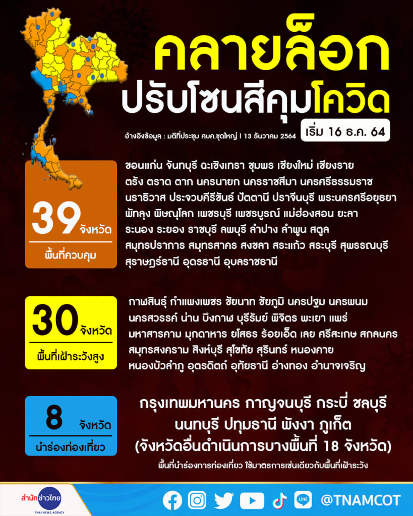 CCSA spokesman Dr. Taweesilp Visanuyothin said the red zones of maximum COVID-19 control in 23 provinces were completely lifted and there were 39 orange provinces, 30 yellow provinces and 8 blue provinces for tourism promotion, up from 7 with Chon Buri as one new blue province, starting from Dec 16.