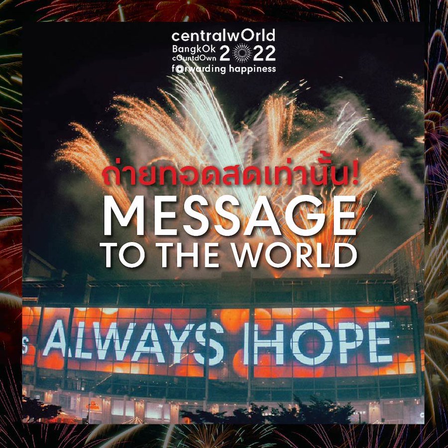 The New Year countdown event will be broadcast via ONE 31, Facebook Fanpage: CentralWorld and the online sites of nationwide Central department stores, Facebook Fanpage: Viu Thailand, Bangkok Post, Post Today, Khaosod, Thairath and Workpoint Entertainment from 10.15pm on Dec 31.