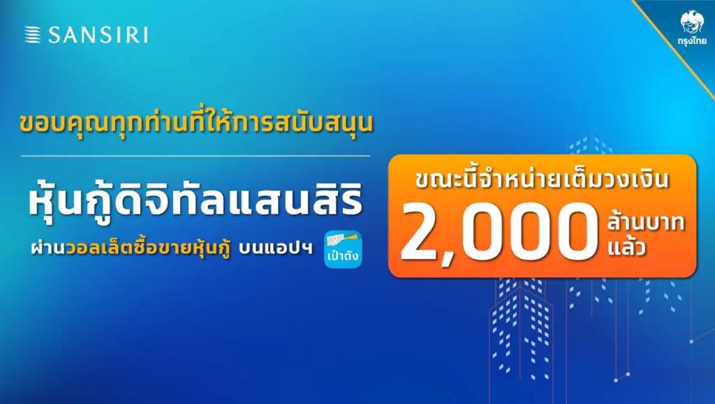 BANGKOK, Jan 18 (TNA) – Property developer Sansiri sold its digital bond worth 2 billion baht via Pao Tang app in only 3.38 minutes, becoming the first digital property bond in Asia.