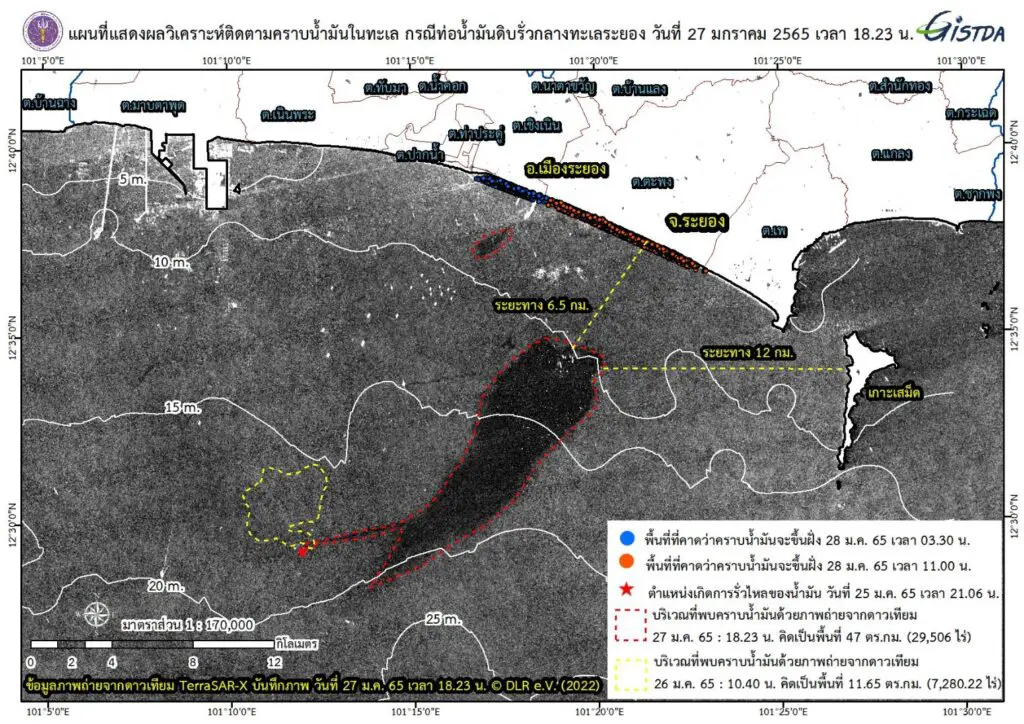 GISTDA released the picture taken by the TerraSAR-X satellite at 6.23pm on Jan 27 as it followed the crude oil leaked from an undersea pipe at a loading buoy in the bay about 20 kilometers southeast of the Map Ta Phut port at the night of Jan 25.