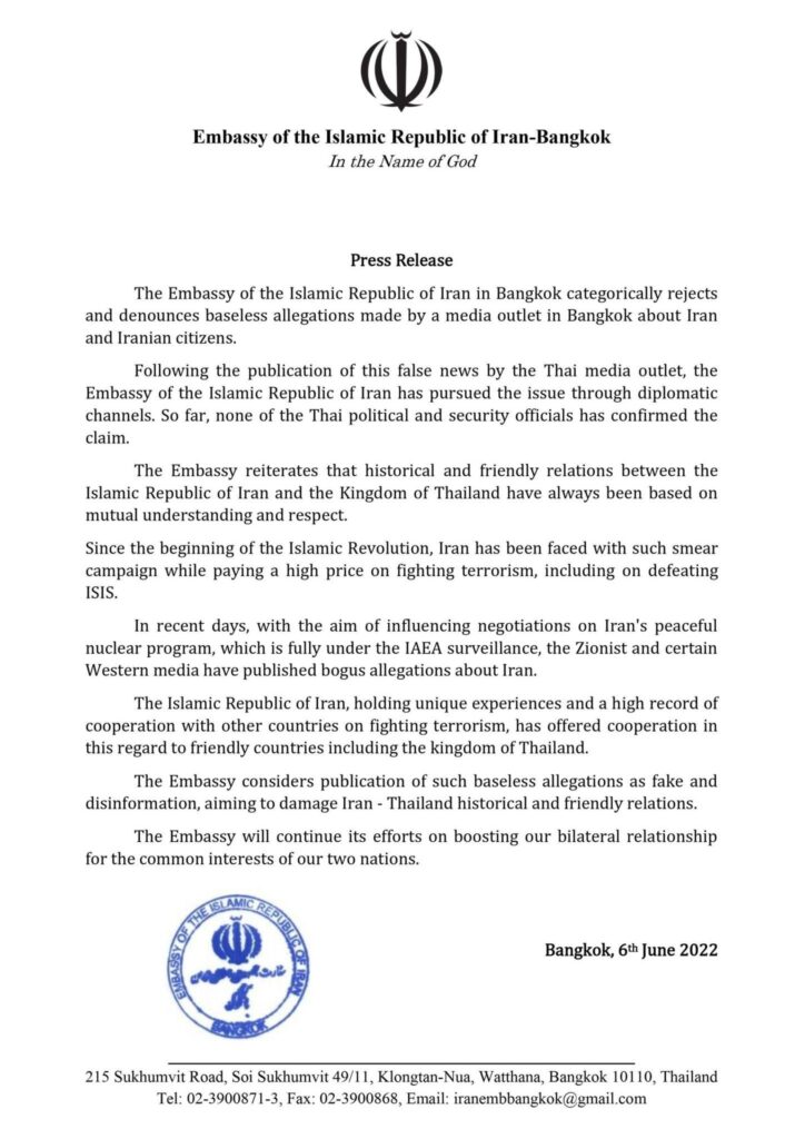 The press release came after the Thai media outlet published the news about the security alert, citing a police source, who said the Royal Thai Police issued a secret order to its officials to keep an eye for spies from Iran after one Iranian national was arrested in Indonesia.