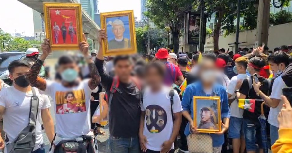The demonstrators who lived in Thailand gathered at the embassy on Sathon Nuea Road in Bang Rak district. They condemned the Myanmar government’s execution of the four democracy and human rights activists including pro-democracy activist Kyaw Min Yu, aka Jimmy, Phyo Zeya Thaw, a former lawmaker of the National League for Democracy Party, and Hla Myo Aung.