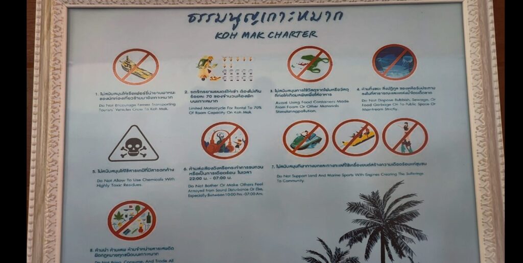 To ensure the long-term sustainability of tourism on the island, in 2018, the community of Koh Mak developed an eight-point “Koh Mak Charter”. This charter outlines a vision for responsible tourism that respects the island’s natural and cultural heritage. Key principles include minimizing carbon emissions, reducing waste, and preserving the island’s unique character.