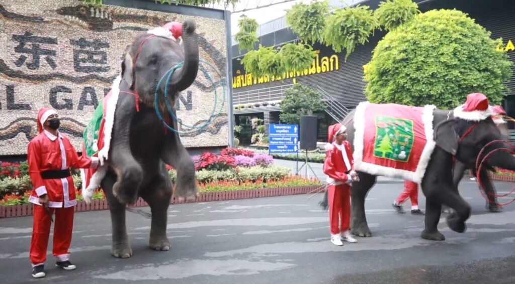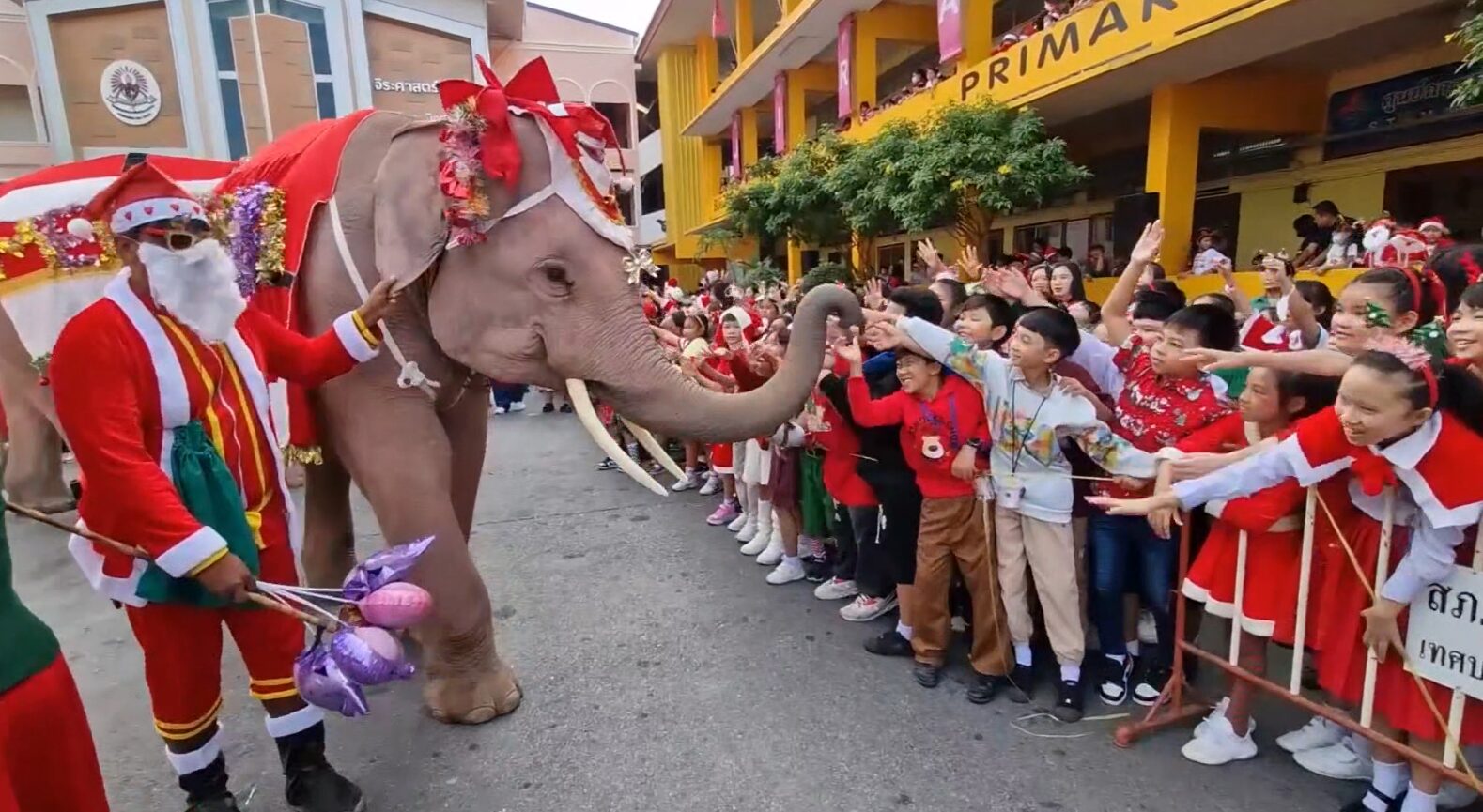 In Ayutthaya province, the Ayutthaya Elephant Palace and Royal Kraal organized a special Christmas gift-giving event for students at Jirasart Wittaya School. Elephants adorned in “Santa Claus” costumes delivered presents to the children.