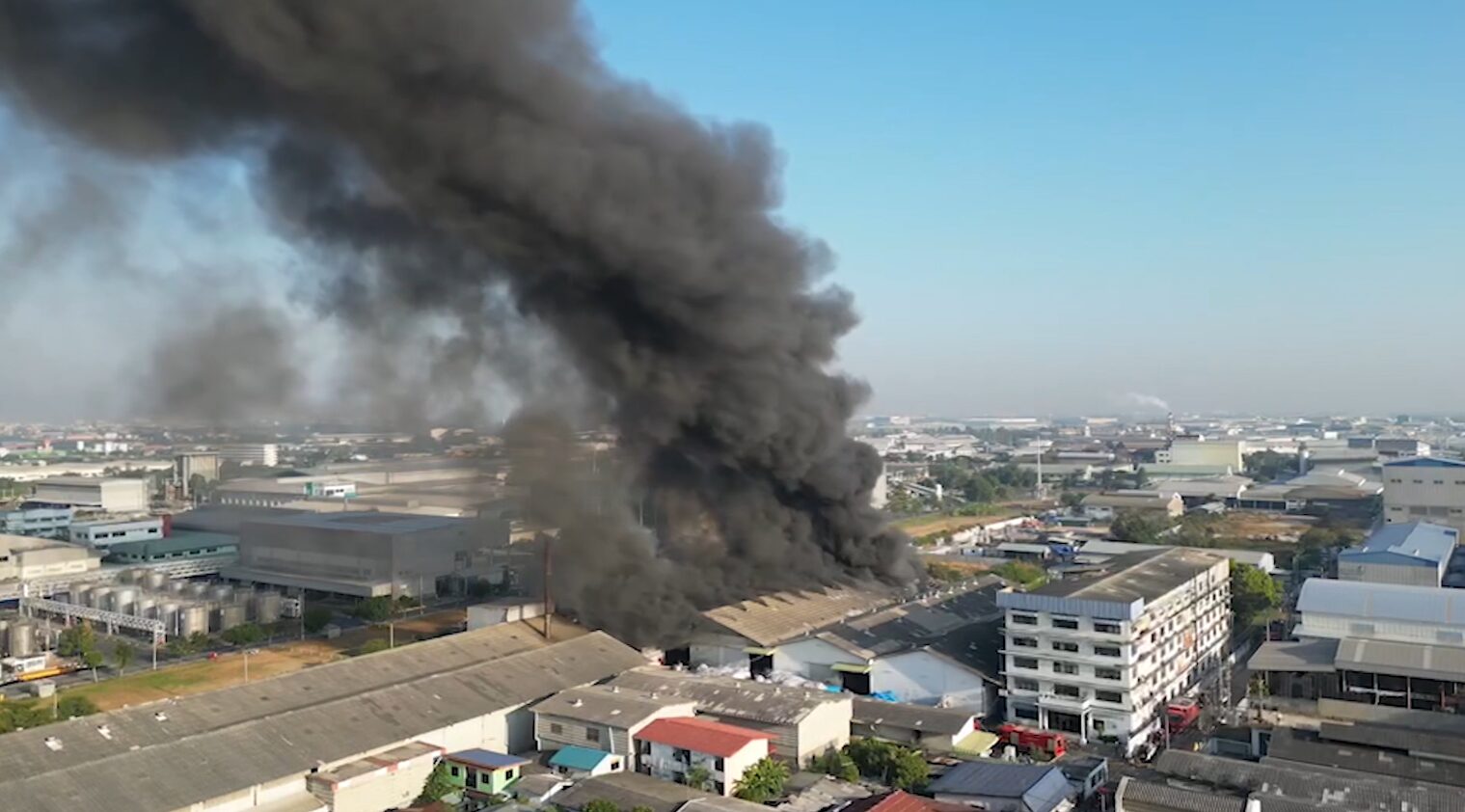 More than 30 fire trucks from Bang Pu municipality and nearby areas were dispatched to the scene, where they found flames engulfing a warehouse, sending plumes of black smoke into the sky. Firefighters took over three hours to bring the blaze under control.