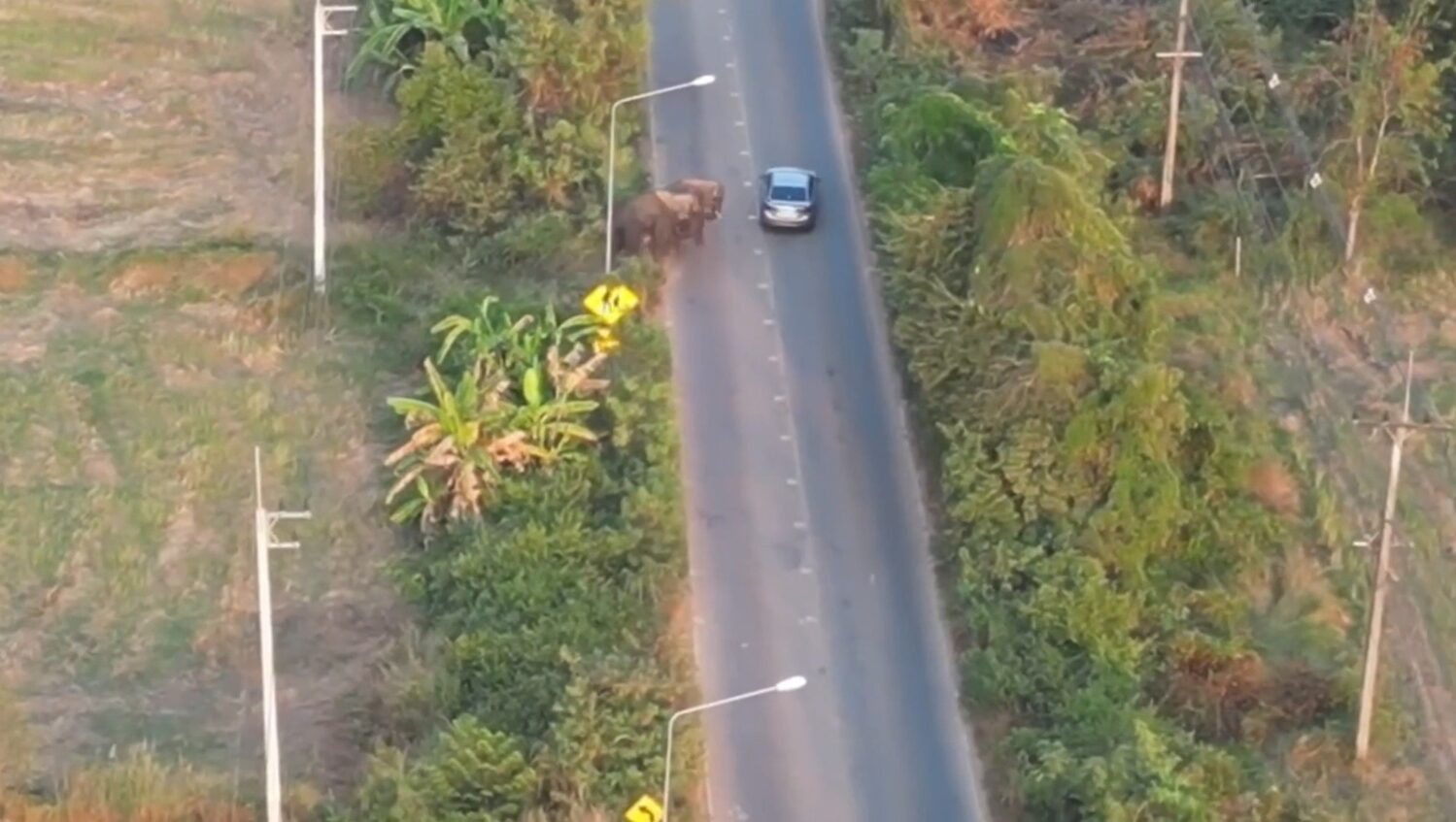 PRACHINBURI, Feb 4 (TNA) – Two wild elephants in Prachin Buri province narrowly avoided a collision with vehicles on a public road, raising concerns about human-wildlife conflict in the area.