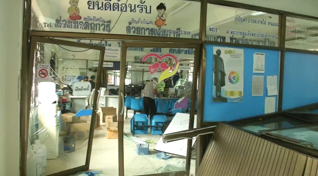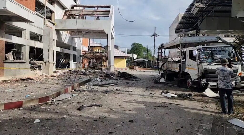 This morning, Sai Thong 2 Road near the district office remained closed to traffic as authorities continued to clear the area of debris and bomb fragments scattered throughout the vicinity.