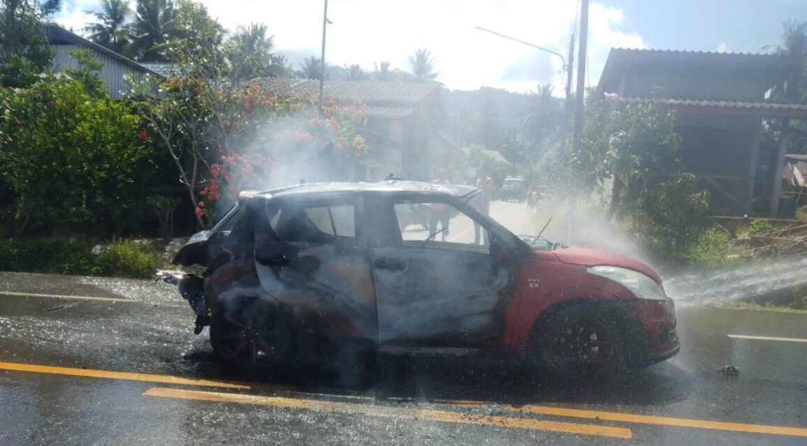 A red Suzuki vehicle belonging to Ms. Sureeyani Seeba, 40, a female defense volunteer, burst into flames as she was driving to work in Kapor district, Pattani province at approximately 9:50 AM Monday morning.