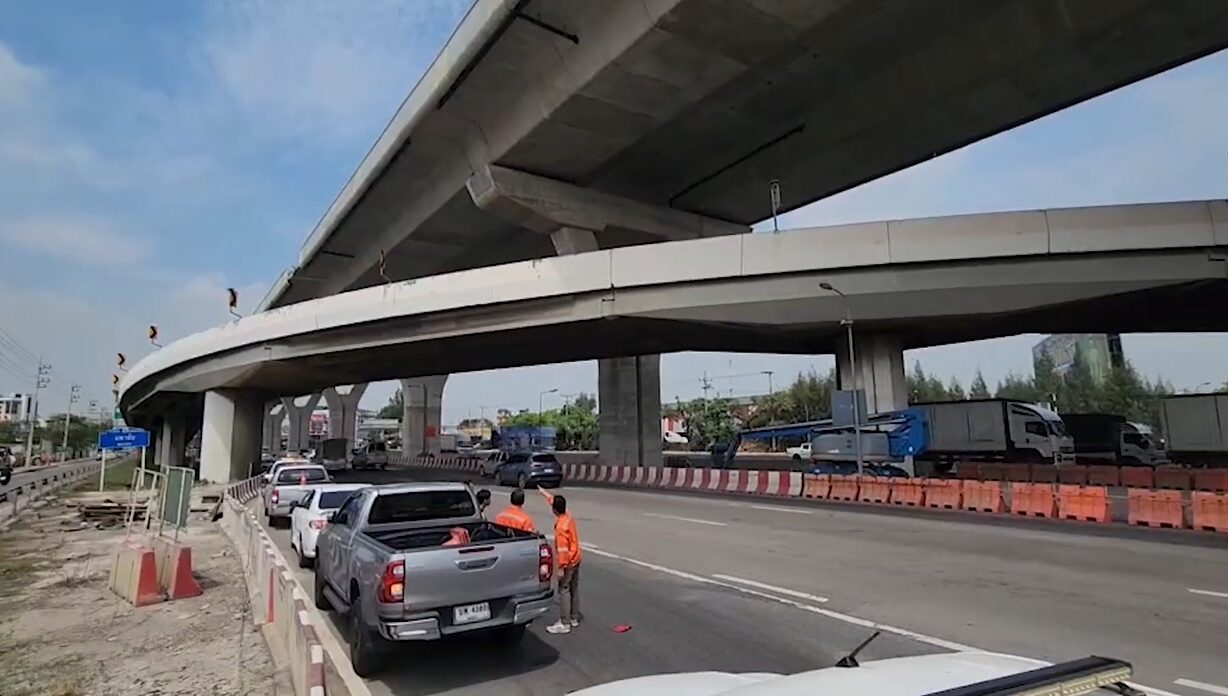 The incident occurred on the outbound express lane of Rama II Road. The concrete is believed to have broken off from the underside of the Mahachai-Krathumbaen elevated bridge, which has been in use for 30 years, according to the director of the Samut Sakhon Highway District.
