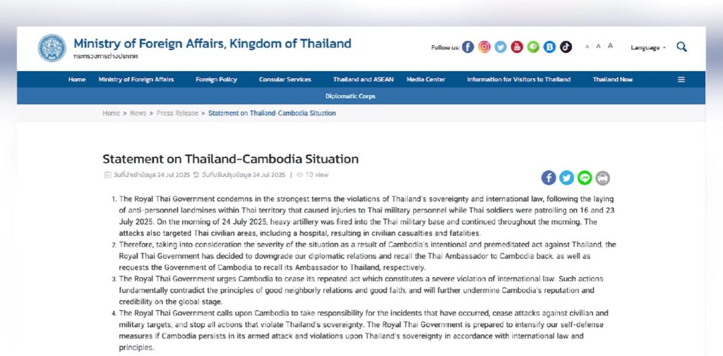 The statement also says that The Royal Thai Government condemns in the strongest terms the violations of Thailand’s sovereignty and international law, following the laying of anti-personnel landmines within Thai territory that caused injuries to Thai military personnel while Thai soldiers were patrolling on 16 and 23 July 2025.