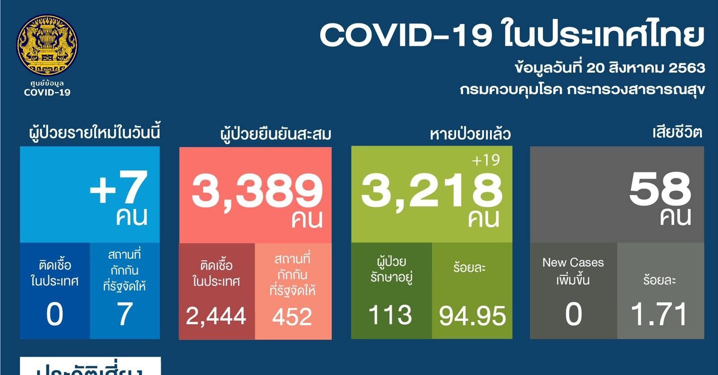 BANGKOK, Aug 20 (TNA) — Seven quarantined returnees are newly confirmed cases of the coronavirus disease 2019, reported the Center for COVID-19 Situation Administration (CCSA).