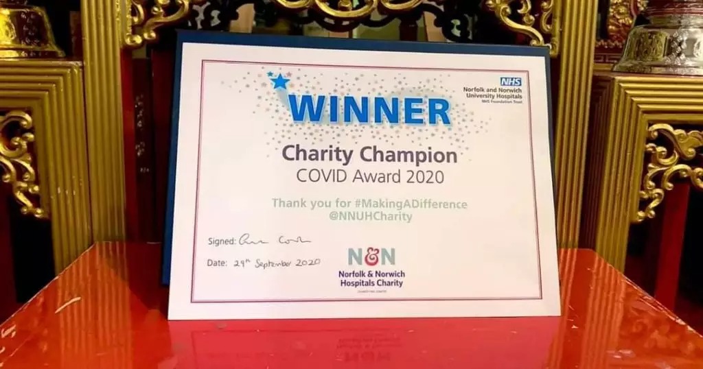 NORWICH, Oct 8 (TNA) – Wat Arun Norfolk UK won the Charity Champion Covid Award after the Thai temple set up an almshouse to support medical personnel and the poor and handle the Covid-19 situation well.
