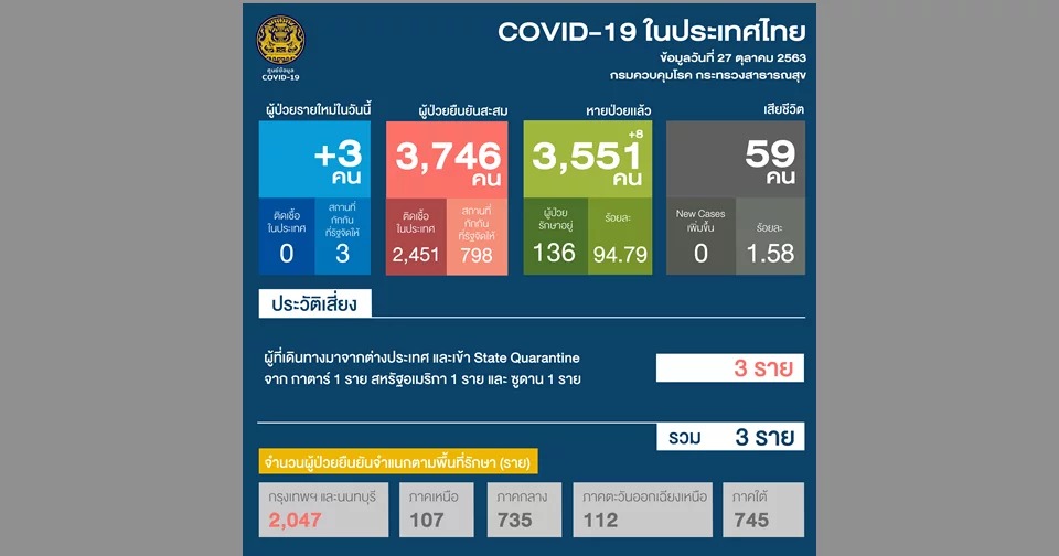 BANGKOK, Oct 27 (TNA) – Thailand reported three new coronavirus cases and all of them are foreigners in state quarantine.