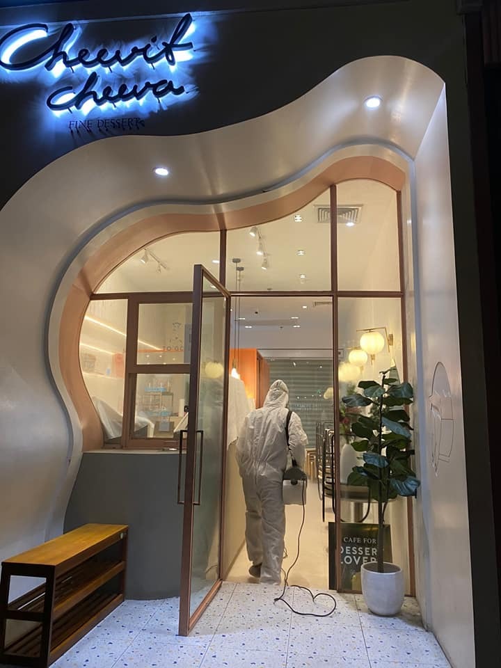 Workers sprayed disinfectant at the shopping center including three premises – Krua Dok Mai Khao and Cheevit Cheeva restaurants and EVEANDBOY cosmetics shop, where the restaurateur visited.