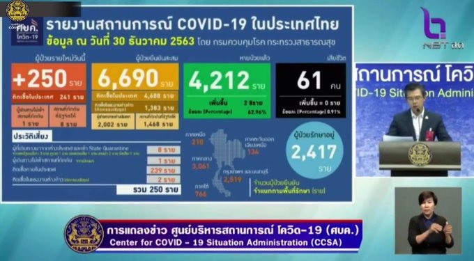 BANGKOK, Dec 30 (TNA) – Thailand on Wednesday reported 250 new cases of Covid-19 including 239 local infections, two migrant workers detected in active testing and eight quarantined arrivals.