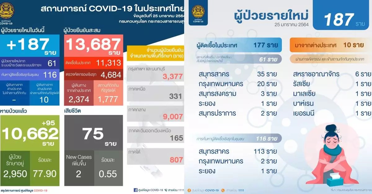 BANGKOK, Jan 25 (TNA) – Thailand recorded two more Covid-19 deaths and 187 new cases on Monday.