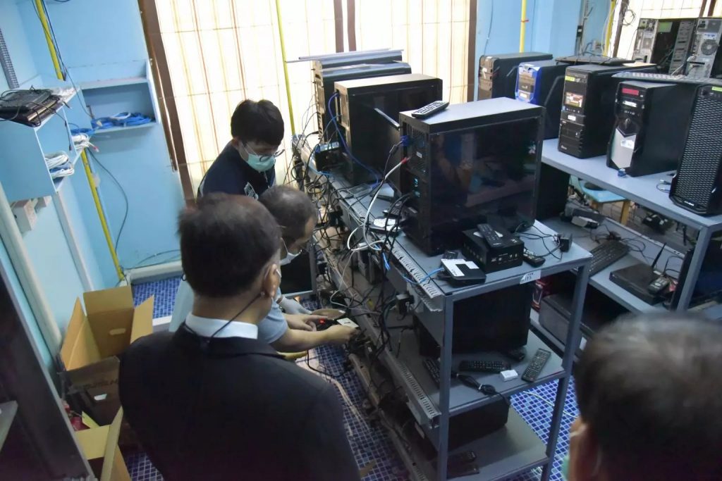In a three-floor commercial building in Nonthaburi, officials found a large number of devices that received live broadcasts and processed signals for retransmission. The equipment was seized for examination.