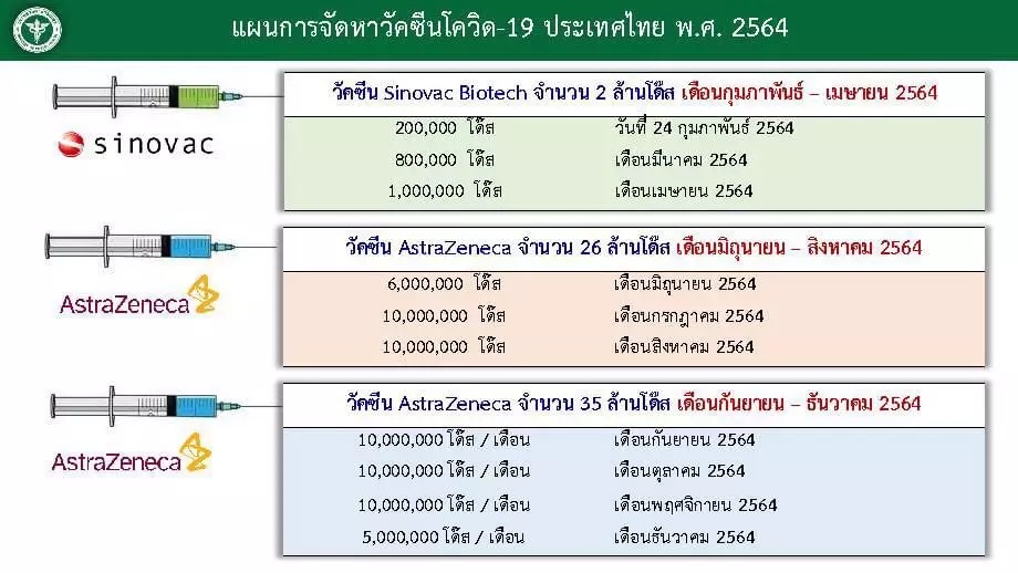 CCSA spokesman Dr Taweesilp Visanuyothin said vaccine would be distributed for three objectives: reducing illness and death especially among vulnerable people, protecting the national health system including medical personnel and disease control workers who were in close contact with COVID-19 patients, and reviving the national economy by vaccinating general people and workers in service, tourism and industrial sectors.