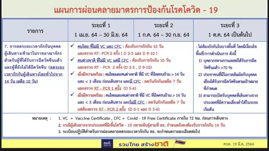BANGKOK, March 19 (TNA) – The Centre for Covid-19 Situation Administration (CCSA) on Friday resolved to shorten quarantine periods for foreign arrivals, beginning on April 1.
