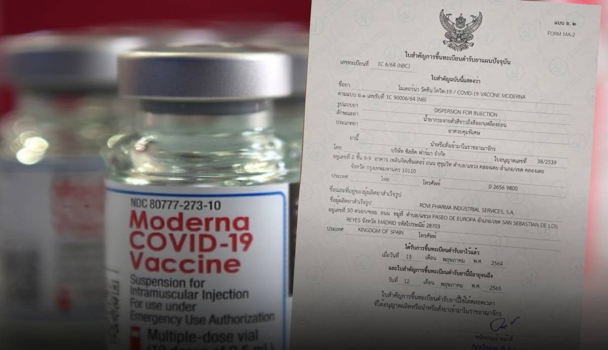 The approval dated on May 13 is for the local use of the mRNA-1273 vaccine of Moderna, imported by Zuellig Pharma Thailand Co.