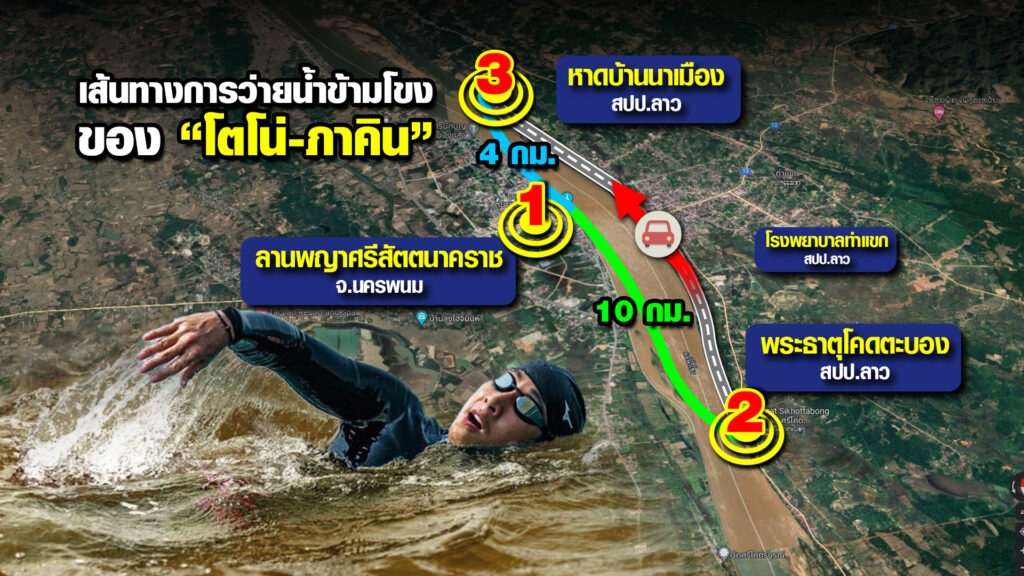 เส้นทางการว่ายน้ำของโตโน่ วันที่ 22 ตุลาคม จะสตาร์ทจากลานพญาศรีสัตตนาคราชฝั่งนครพนม ว่ายตามน้ำ 10 กิโลเมตร ข้ามไปขึ้นฝั่งลาว ที่พระธาตุศรีโคดตะบอง แต่ขากลับไม่ได้ว่ายทวนน้ำมา แต่ตีรถย้อนขึ้นไป 15 กม. ไปที่หาดบ้านนาเมืองฝั่งลาว แล้วว่ายตามน้ำ 5 กิโลเมตร ข้ามมาขึ้นฝั่งไทยที่ลานพญาศรีสัตตนาคราชเหมือนเดิม ซึ่งเป็นการว่ายตามน้ำทั้งขาไปและขากลับ