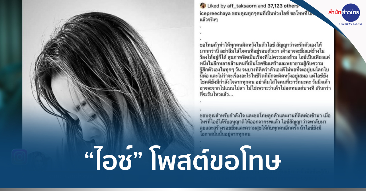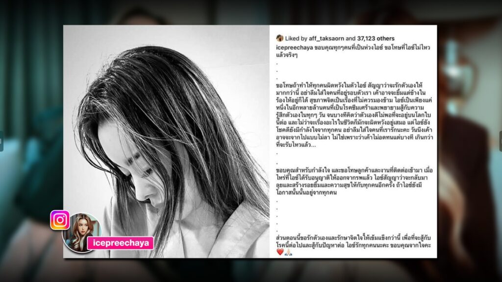 “ขอบคุณทุกๆ คน ที่เป็นห่วงไอซ์ ขอโทษที่ไอซ์ไม่ไหวแล้วจริงๆ ขอโทษถ้าทำให้ทุกคนผิดหวังในตัวไอซ์ สัญญาว่าจะรักตัวเองให้มากกว่านี้ อย่าลืมใส่ใจคนที่อยู่รอบตัวเรา เขาอาจจะยิ้มแต่ข้างในร้องไห้อยู่ก็ได้ สุขภาพจิตเป็นเรื่องที่ไม่ควรมองข้าม ไอซ์เป็นเพียงแค่หนึ่งในอีกหลายล้านคนที่เป็นโรคซึมเศร้าและพยายามสู้กับความรู้สึกตัวเองในทุกๆ วัน จนบางทีคิดว่าตัวเองดีไม่พอที่จะอยู่บนโลกใบนี้ต่อ และไม่ว่าจะเรื่องอะไรในชีวิตก็มักจะผิดหวังอยู่เสมอ แต่ไอซ์ยังโชคดียังมีกำลังใจจากทุกคน อย่าลืมใส่ใจคนที่เรารักนะคะ วันหนึ่งเขาอาจจะจากไปแบบไม่ลา ไม่ใช่เพราะว่าเขาไม่อดทน แต่บางทีเกินกว่าที่จะรับไหวแล้ว ขอบคุณสำหรับกำลังใจและขอโทษลูกค้าและงานที่ติดต่อเข้ามา เมื่อไรที่ไอซ์ได้รับอนุญาตให้ออกจาก รพ.แล้ว ไอซ์สัญญาว่าจะกลับมาลุยและสร้างรอยยิ้มและความสุขให้กับทุกคนอีกครั้ง ถ้าไอซ์ยังมีโอกาสนั้นๆ อยู่จากทุกคน ส่วนตอนนี้ขอรักตัวเองและรักษาจิตใจให้เข้มแข็งกว่านี้ เพื่อที่จะสู้กับโรคนี้ต่อไป และสู้กับปัญหาต่อ ไอซ์รักทุกคนนะคะ ขอบคุณจากใจค่ะ”