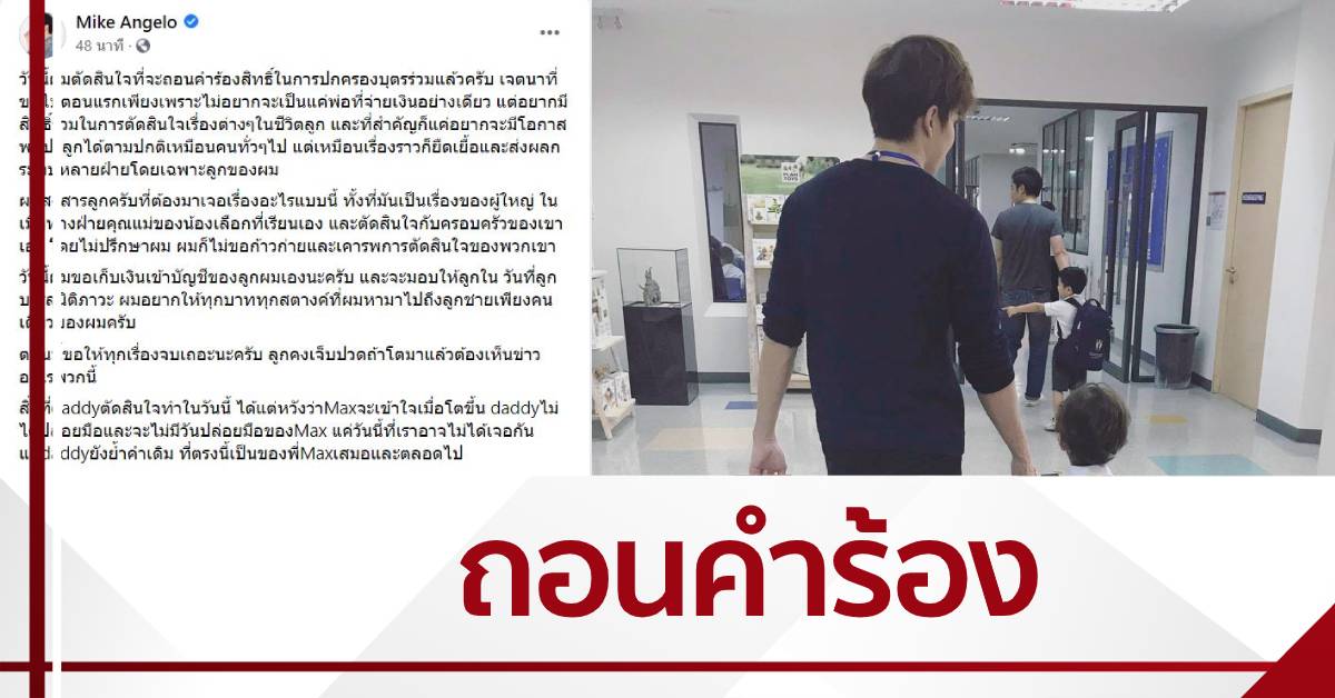 สำนักข่าวไทย 6 ต.ค.-“ไมค์ พิรัชต์” โพสต์เฟซบุ๊ก ขอถอนคำร้องสิทธิในการปกครองบุตรร่วมแล้ว สงสารลูกที่ต้องมาเจอเรื่องแบบนี้ ขอเก็บเงินเข้าบัญชีของเอง และจะมอบให้ลูก ในวันที่ลูกบรรลุนิติภาวะ อยากให้ทุกบาททุกสตางค์ที่หามาไปถึงลูกชายเพียงคนเดียว