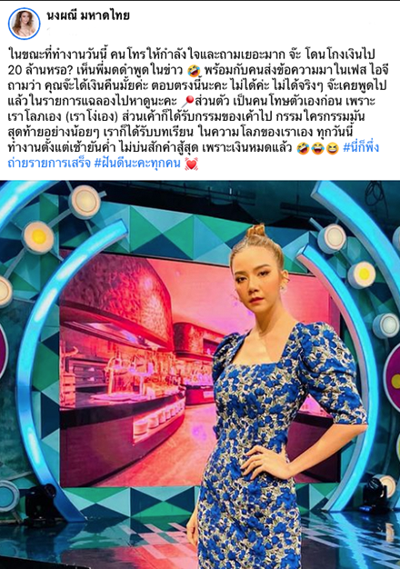 “จ๊ะ” นักร้องลูกทุ่งชื่อดัง โพสต์ข้อความผ่านเฟซบุ๊กส่วนตัว “นงผณี มหาดไทย” ข้อความว่า “ในขณะที่ทำงานวันนี้ คนโทรให้กำลังใจและถามเยอะมาก จ๊ะ โดนโกงเงินไป 20 ล้านหรอ? เห็นพี่มดดำพูดในข่าว 🤣 พร้อมกับคนส่งข้อความมาในเฟส ไอจี ถามว่า คุณจ๊ะได้เงินคืนมั้ยค่ะ ตอบตรงนี้นะคะ ไม่ได้ค่ะ ไม่ได้จริงๆ จ๊ะเคยพูดไปแล้วในรายการแฉลองไปหาดูนะคะ 📍ส่วนตัว เป็นคนโทษตัวเองก่อน เพราะเราโลภเอง (เราโง่เอง) ส่วนเค้าก็ได้รับกรรมของเค้าไป กรรมใครกรรมมัน สุดท้ายอย่างน้อยๆ เราก็ได้รับบทเรียน ในความโลภของเราเอง ทุกวันนี้ ทำงานตั้งแต่เช้ายันค่ำ ไม่บ่นสักคำสู้สุด เพราะเงินหมดแล้ว 🤣😂😆 #นี่ก็พึ่งถ่ายรายการเสร็จ #ฝันดีนะคะทุกคน 💓”